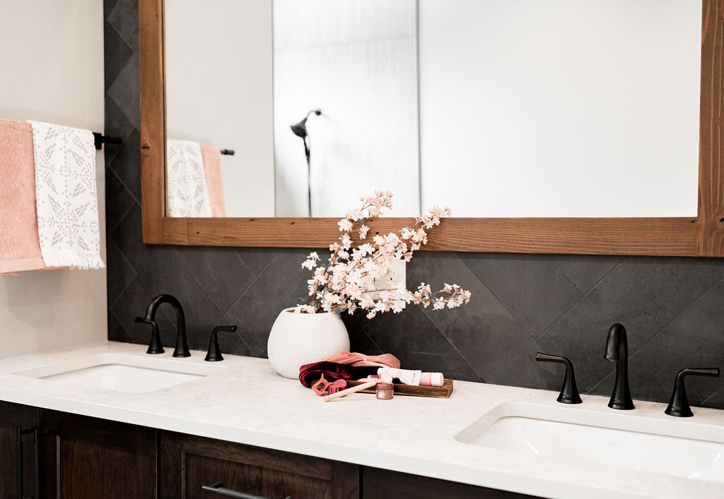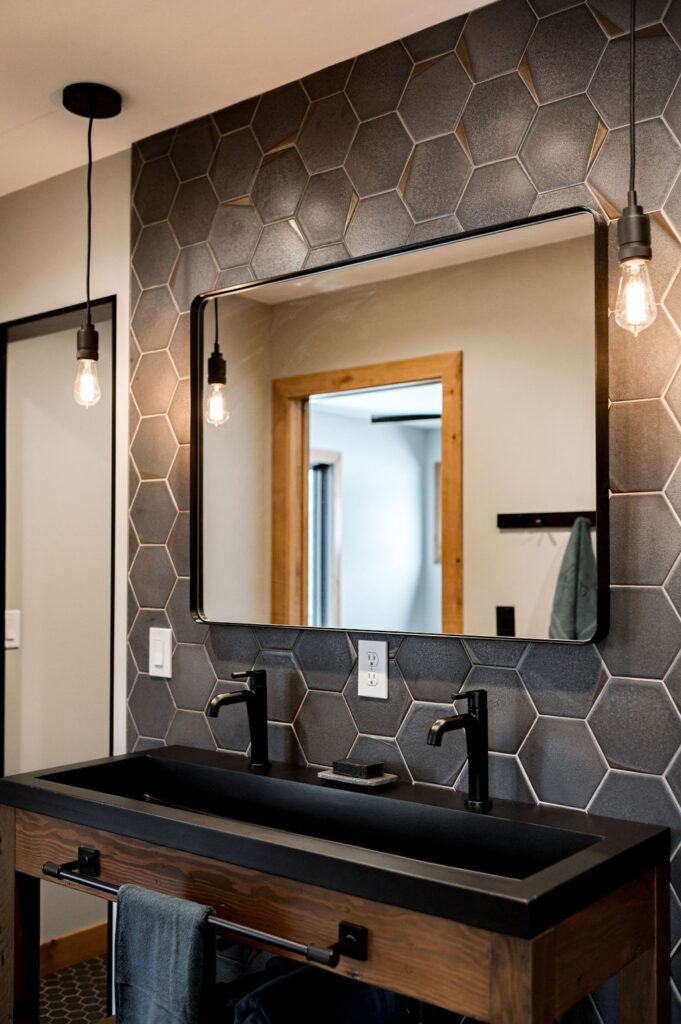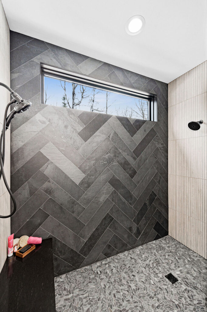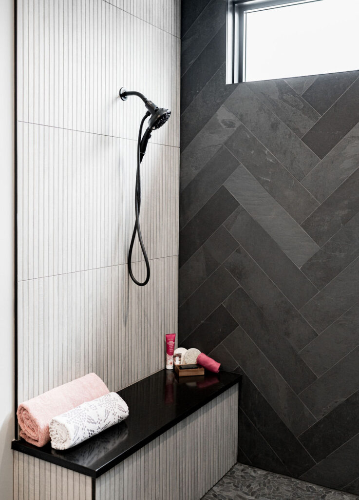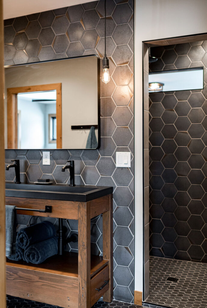 The bathrooms in this home blend bold geometrics and modern craftsmanship to create striking memorable spaces. The result is stylish, thoughtfully designed bathrooms that feel both modern and inviting with an elevated look.