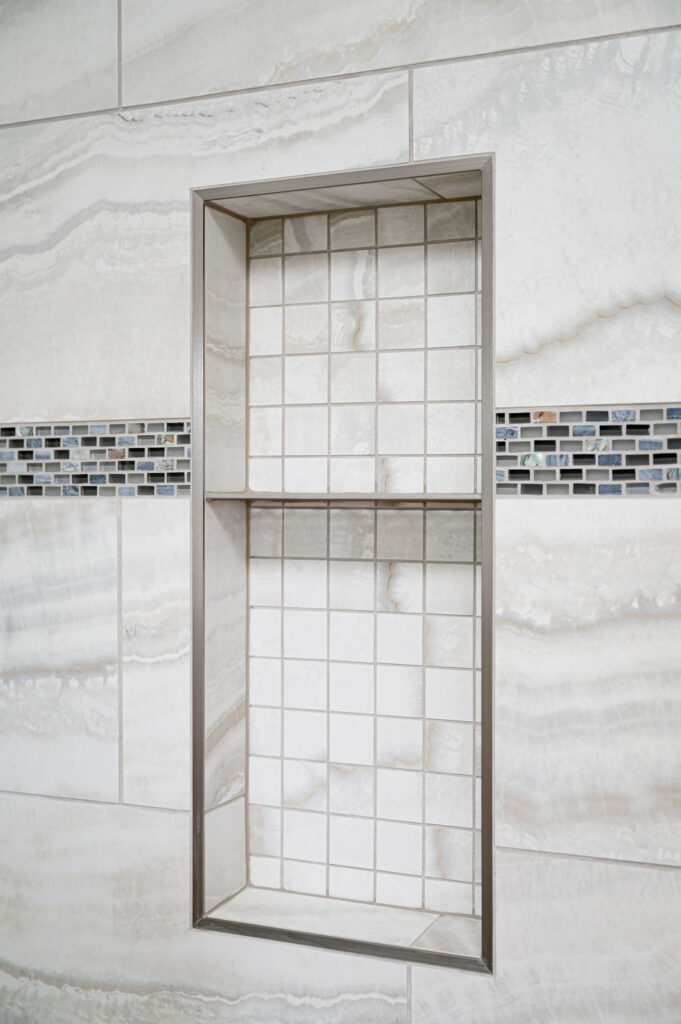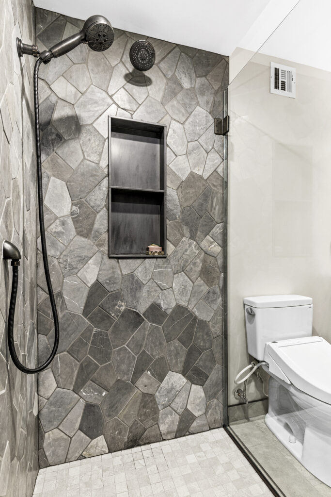 These bathroom remodels make a striking statement with bold color layered through distinctive tile choices and expressive wallpaper. The combination adds depth and personality, transforming into a vibrant space. Carefully selected patterns and hues work together to create visual interest while maintaining a polished, intentional design. Reimagine your space. Let’s discuss your ideas