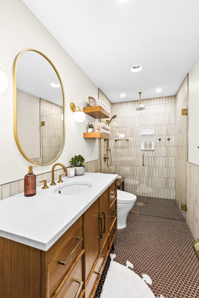 Renewed Relaxed Romantic This bathroom renovation embraces warm, inviting tones paired with natural wood accents to create a calm, spa-like atmosphere. Soft beige and sandy hues are balanced by rich wooden cabinetry and shelving, adding texture and organic warmth to the space. The result is a timeless, comfortable bathroom that feels both modern and naturally […]