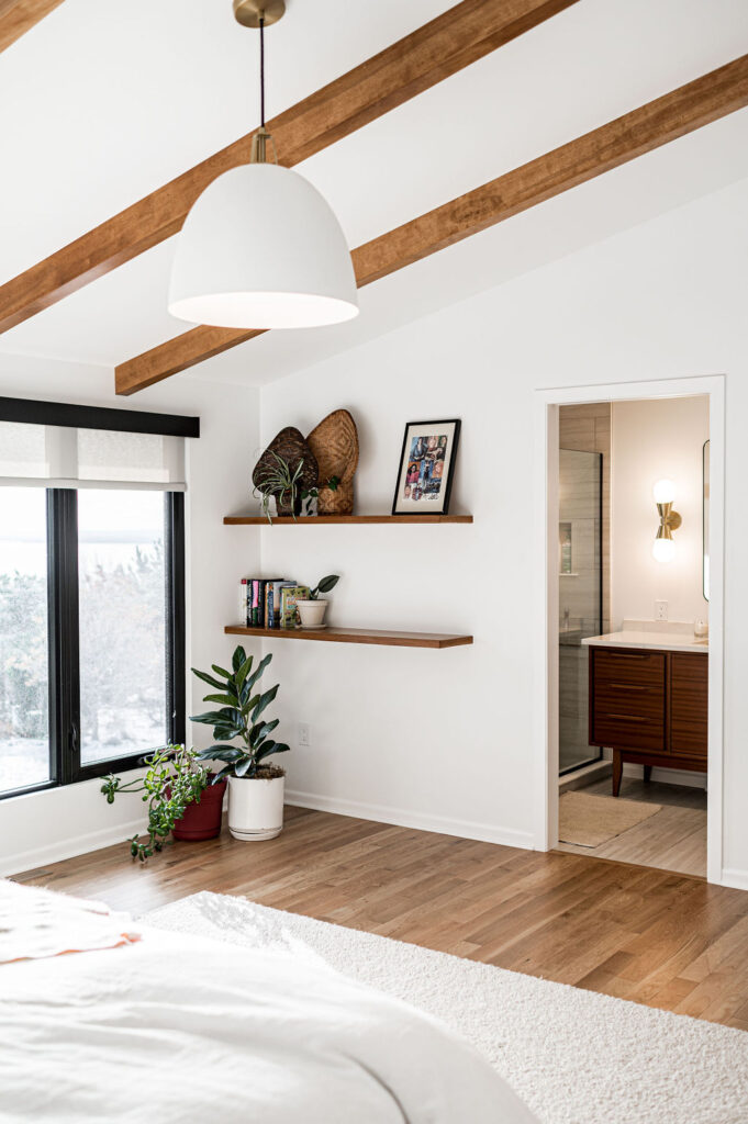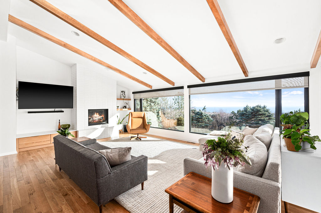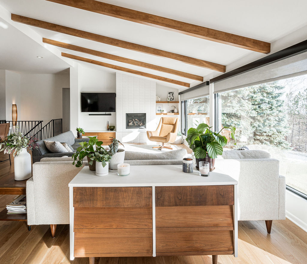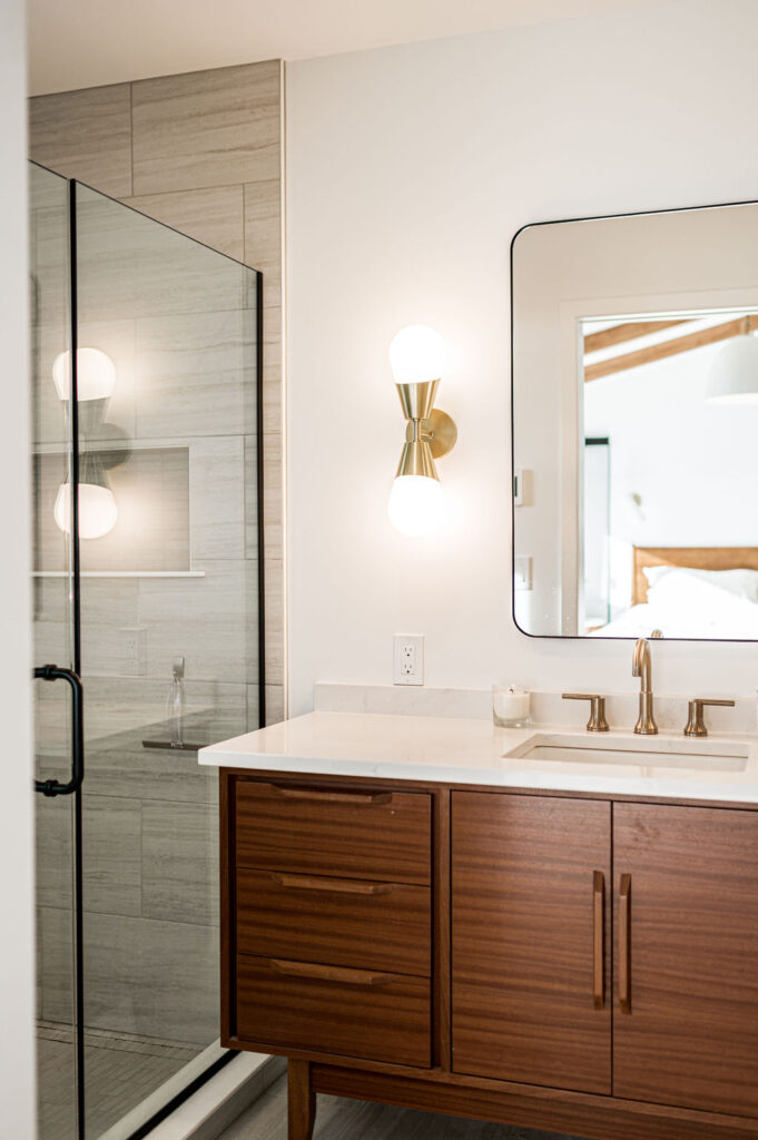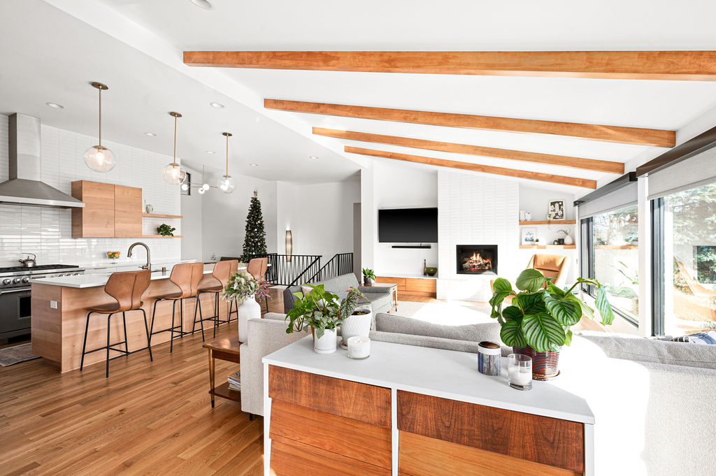 This mid-century modern home remodel thoughtfully weaves authentic design elements throughout every space, honoring the era’s signature style while maintaining a serene, livable atmosphere. Bold design statements are balanced with a quiet, calming palette, creating visual interest without overwhelming the senses. Rich mahogany cabinetry brings warmth and timeless character to the bathrooms, while a striking tile fireplace serves as a central architectural feature. Wooden accent beams add depth and craftsmanship, reinforcing the home’s cohesive, nostalgic charm with a refined modern touch.
