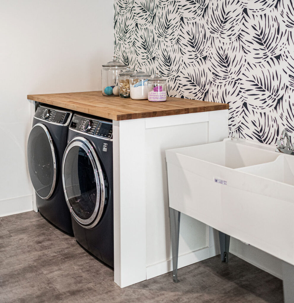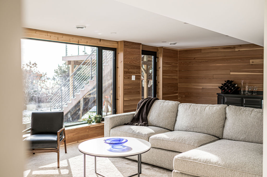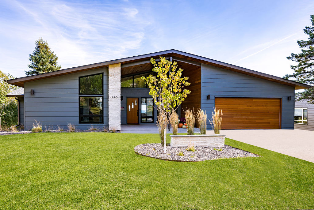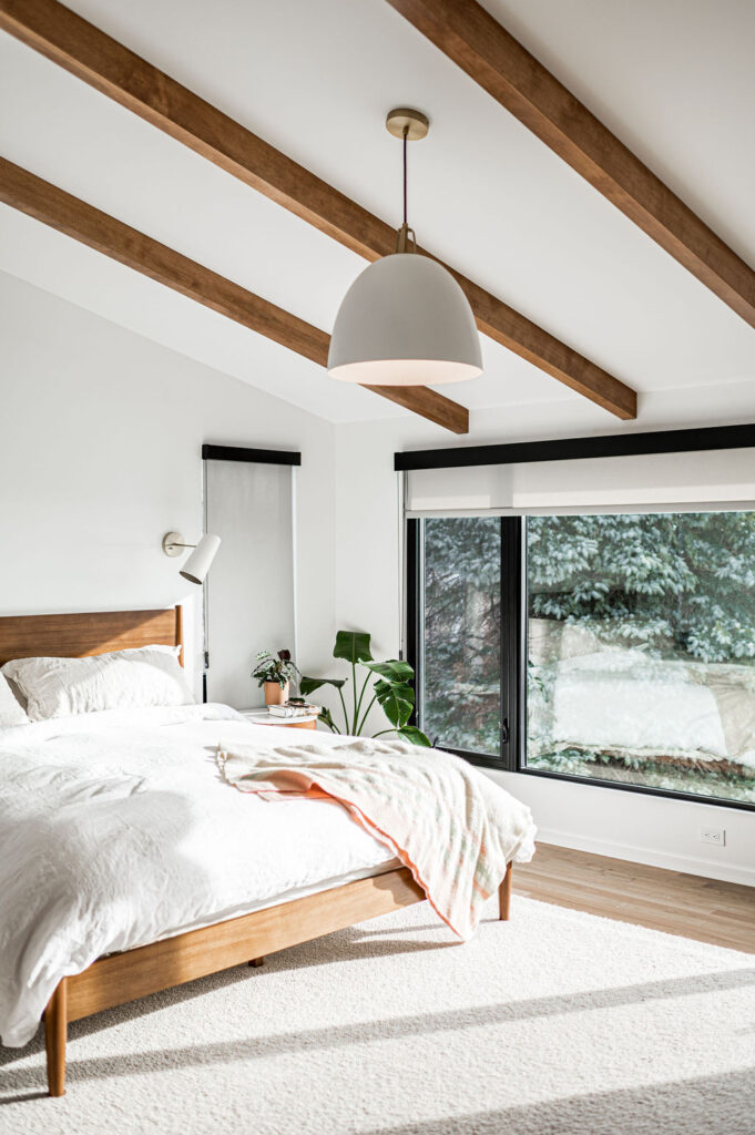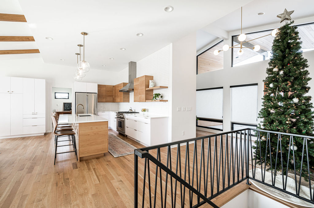 This mid-century modern home remodel thoughtfully weaves authentic design elements throughout every space, honoring the era’s signature style while maintaining a serene, livable atmosphere. Bold design statements are balanced with a quiet, calming palette, creating visual interest without overwhelming the senses. Rich mahogany cabinetry brings warmth and timeless character to the bathrooms, while a striking tile fireplace serves as a central architectural feature. Wooden accent beams add depth and craftsmanship, reinforcing the home’s cohesive, nostalgic charm with a refined modern touch.