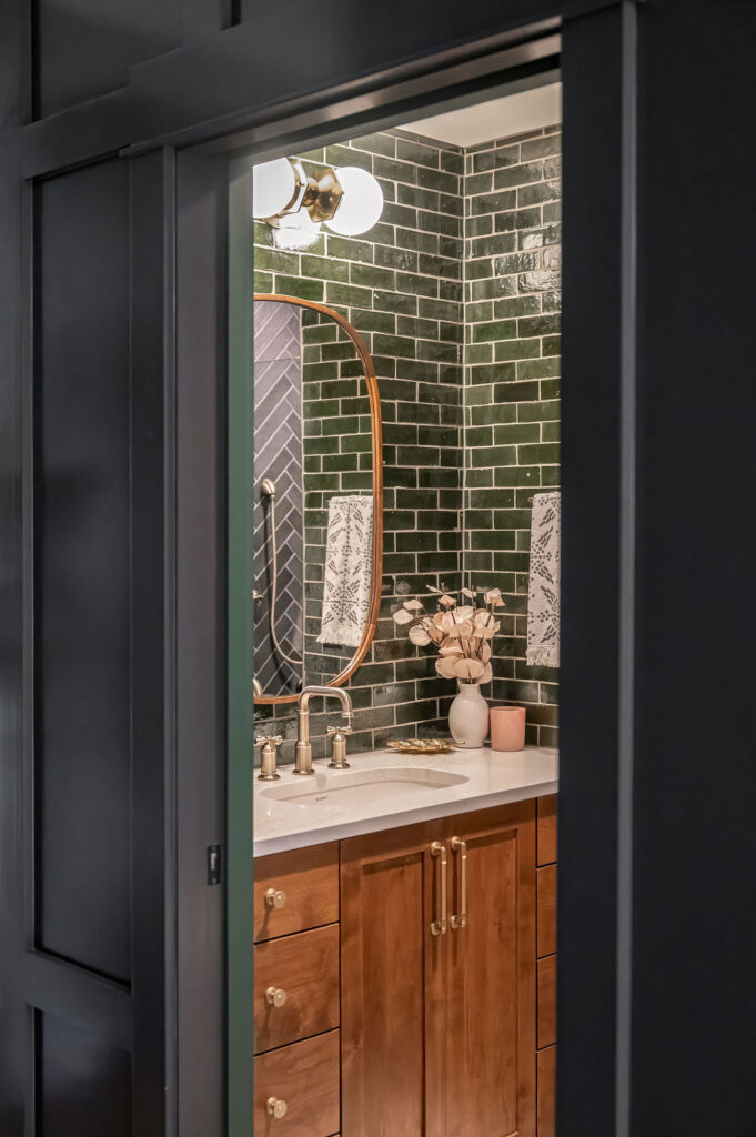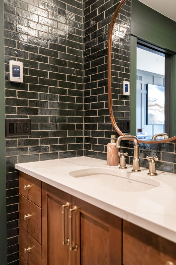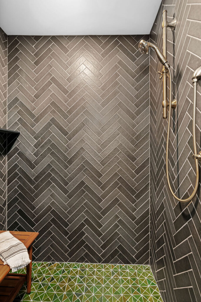 This bathroom design makes a striking statement with bold, eye-catching tile that brings energy and personality through its vibrant color and dynamic layout. Rich wood cabinetry grounds the space with warmth and natural texture, creating a balanced contrast against the lively tilework. Elegant gold hardware adds a layer of sophistication and subtle glamour, tying the design together with a refined, polished finish that feels both modern and inviting.