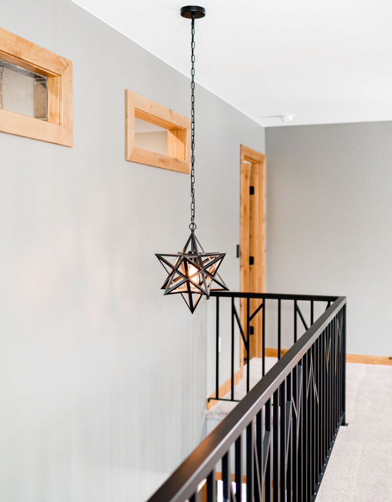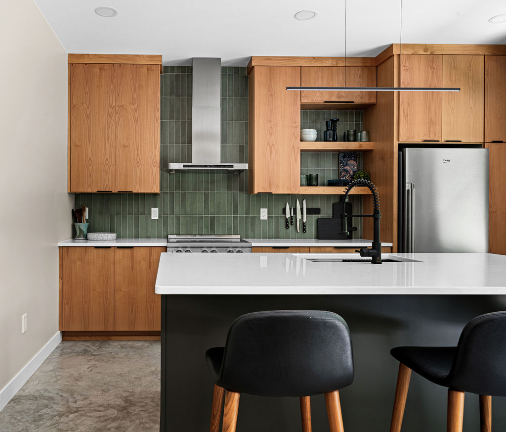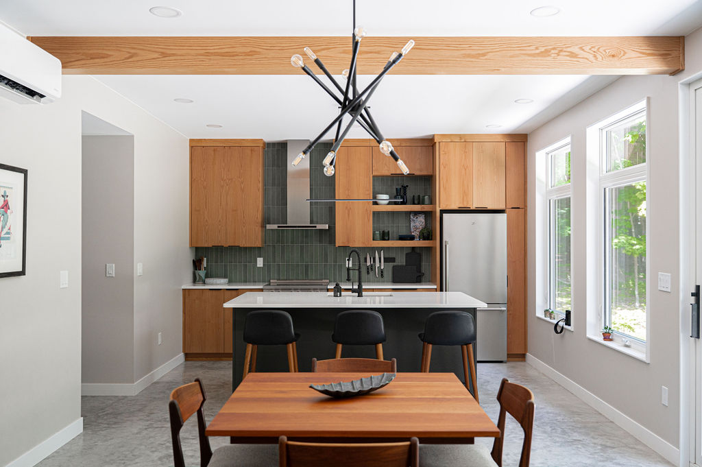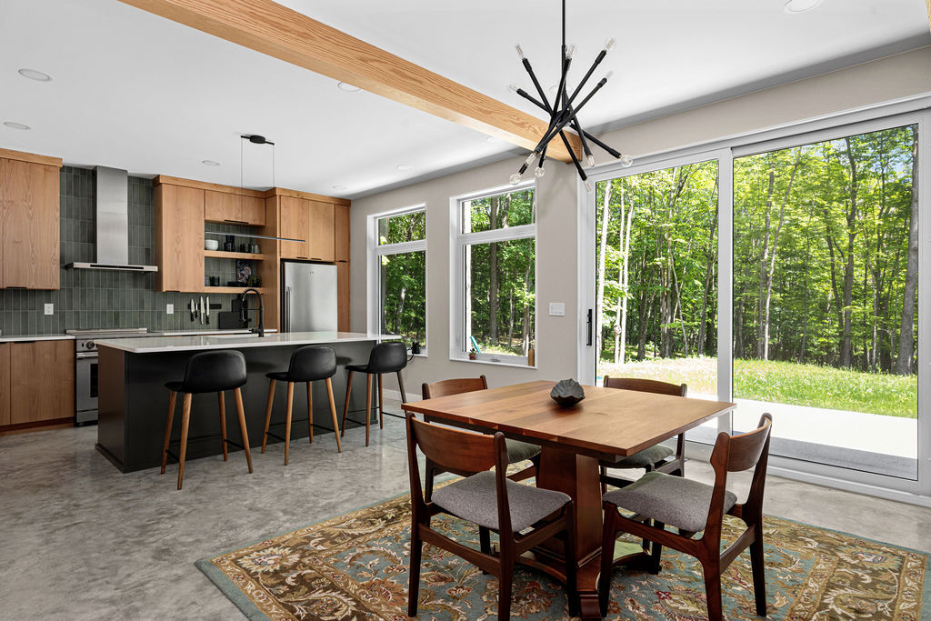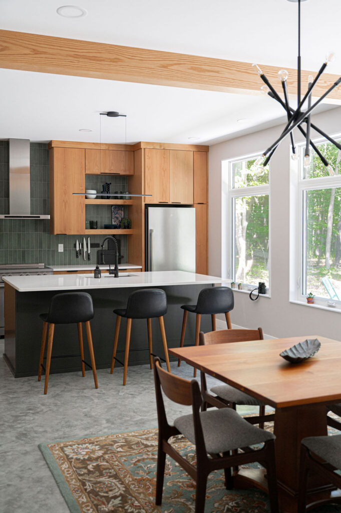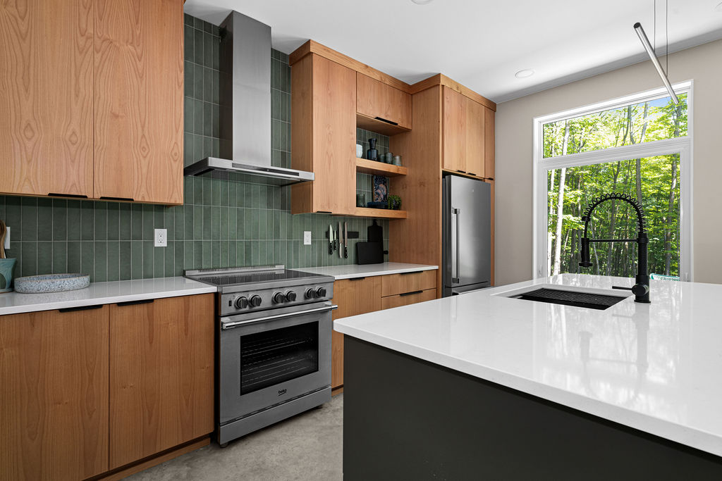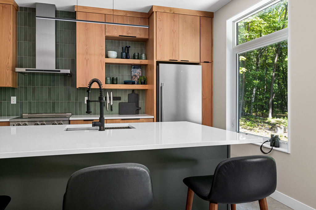 This functional kitchen offers all of the essential elements for a modern cabin. Clean lines of the cabinetry in warm wood pairs with the durability of the stone and concrete for a grounded unfussy feel. The materials create a space that feels practical, inviting and connected to the surrounding woods.