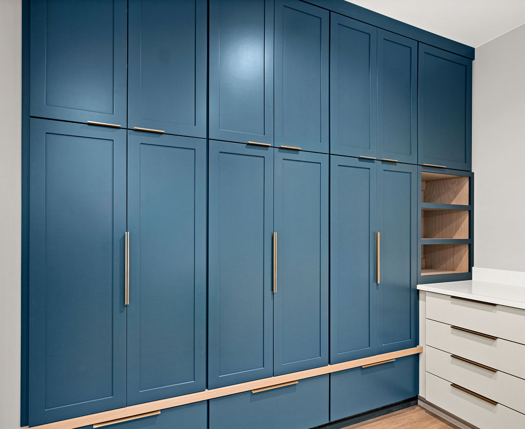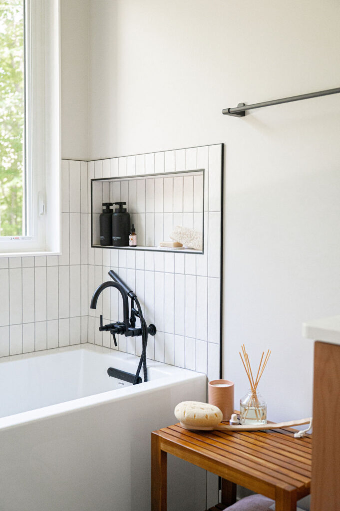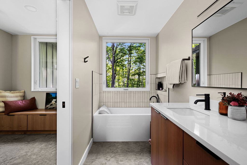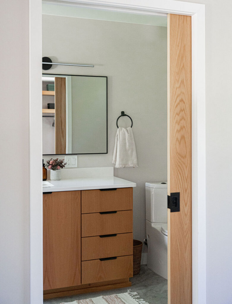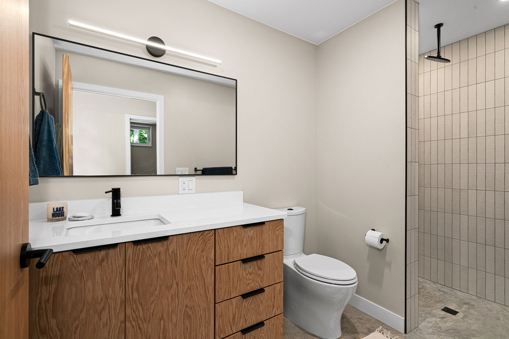 A simple, thoughtfully designed bathroom complements the modern cabin’s natural surroundings with warm wood cabinetry that adds organic texture and understated charm. Matte black hardware provides a sleek, contemporary contrast while maintaining a cohesive, minimalist feel. The neutral color palette keeps the space calm and timeless, allowing natural materials and clean lines to take center stage, creating a functional yet inviting retreat that blends effortlessly with the wooded setting.