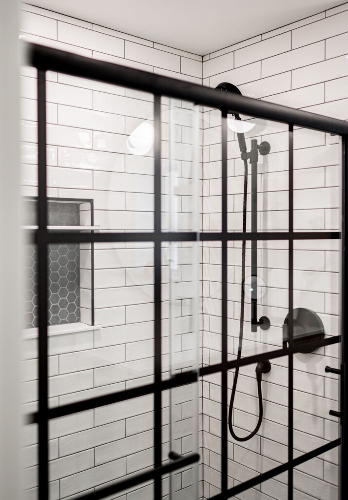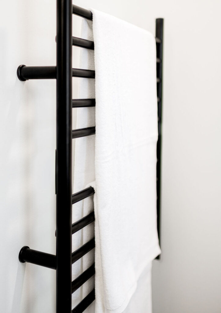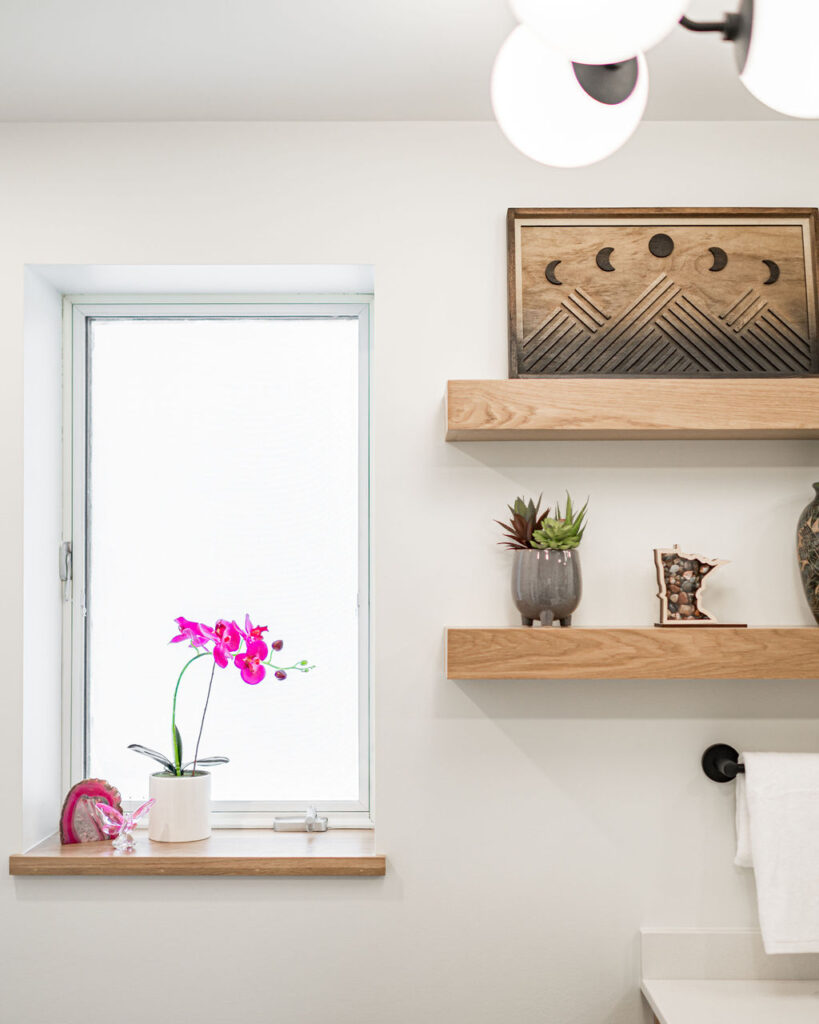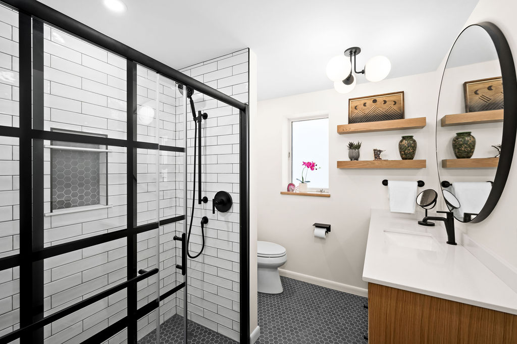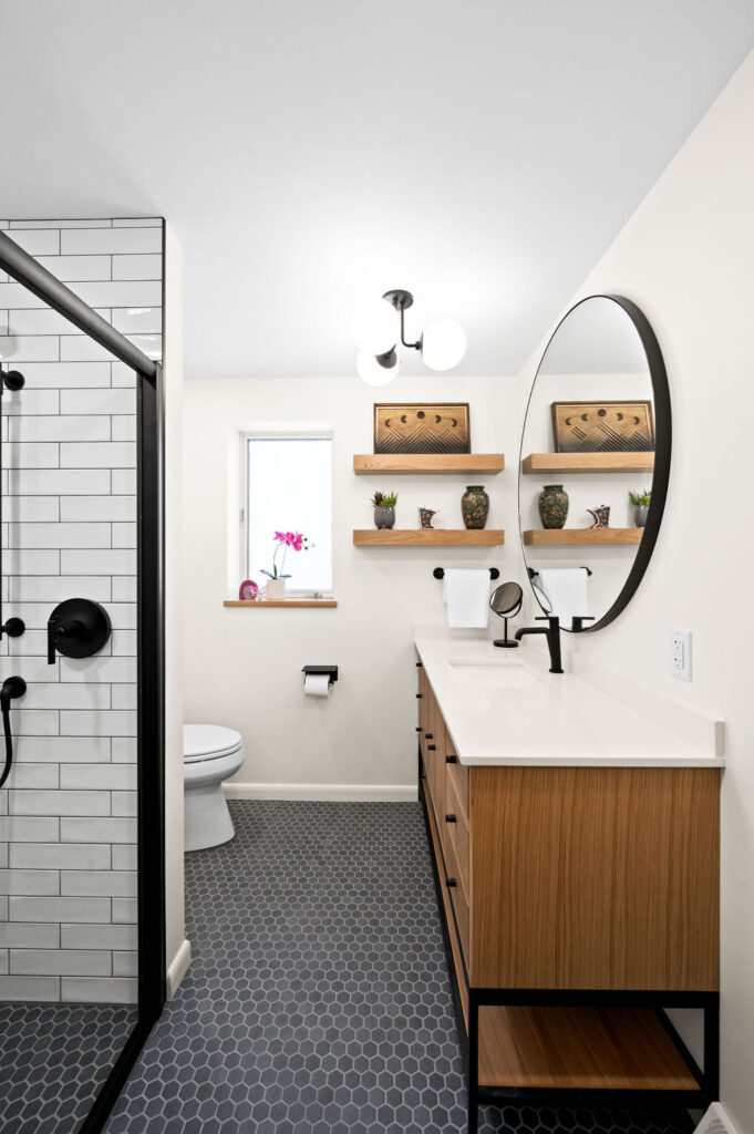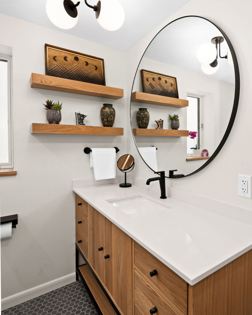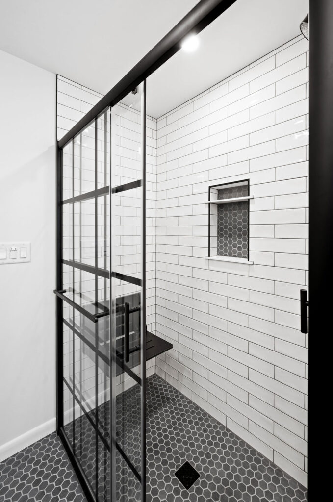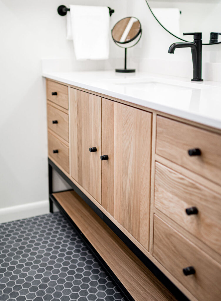 Take this client owned vanity and create a lower level bathroom haven. The use of wood, metal and tile warm up this space with bold style. Accessories like the towel bar warmer and the shower seat are perfect for welcoming your guests.